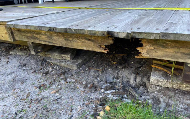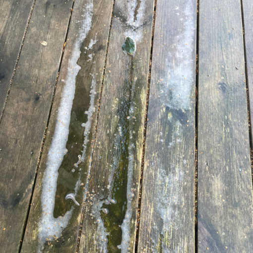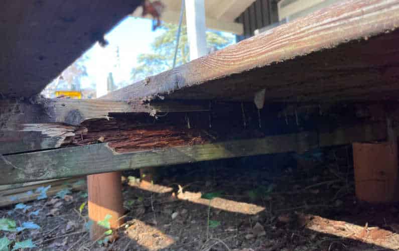 Hold øje med begyndende råd i overfladen, endestykker og bærende bjælker i mellemrummet mellem brædderne.