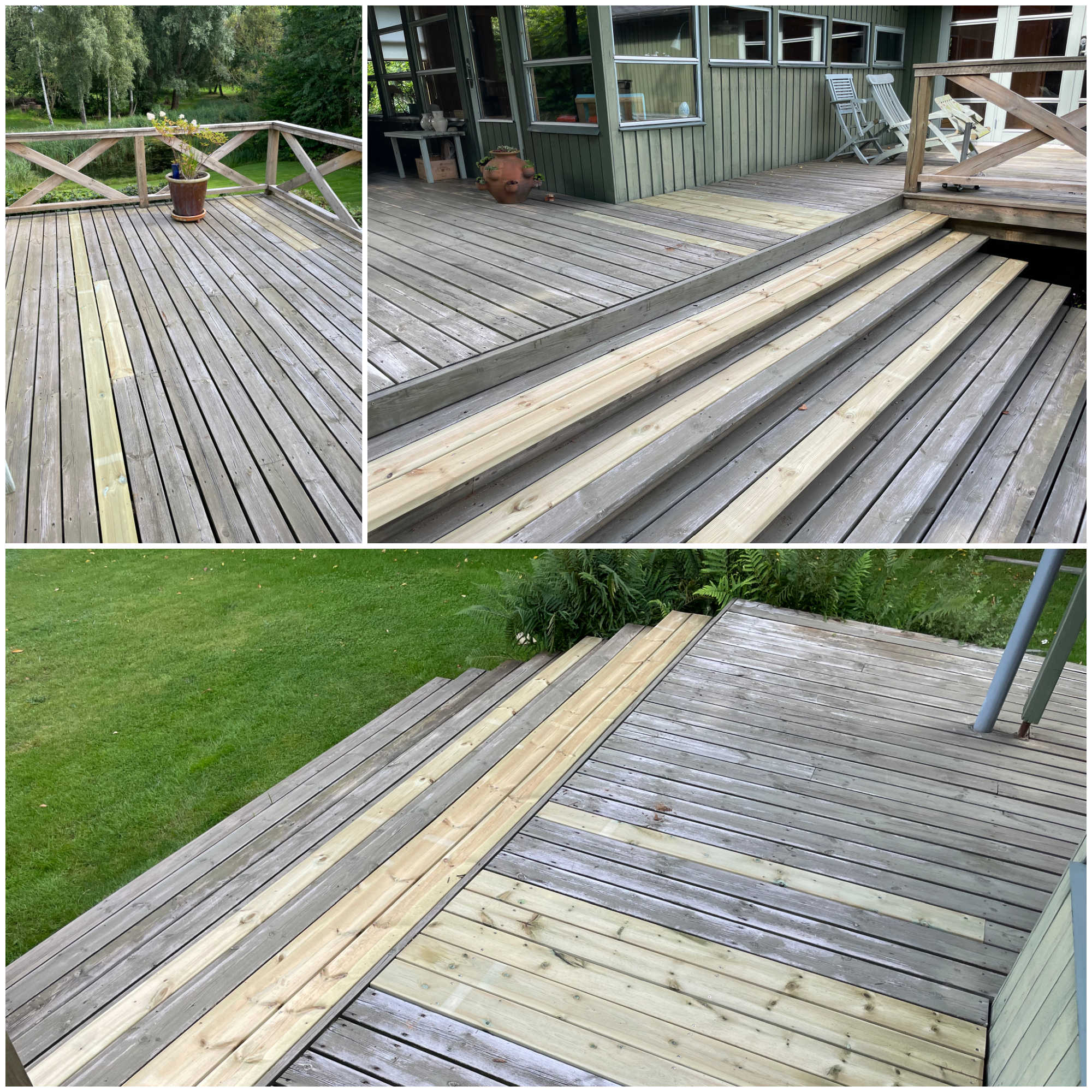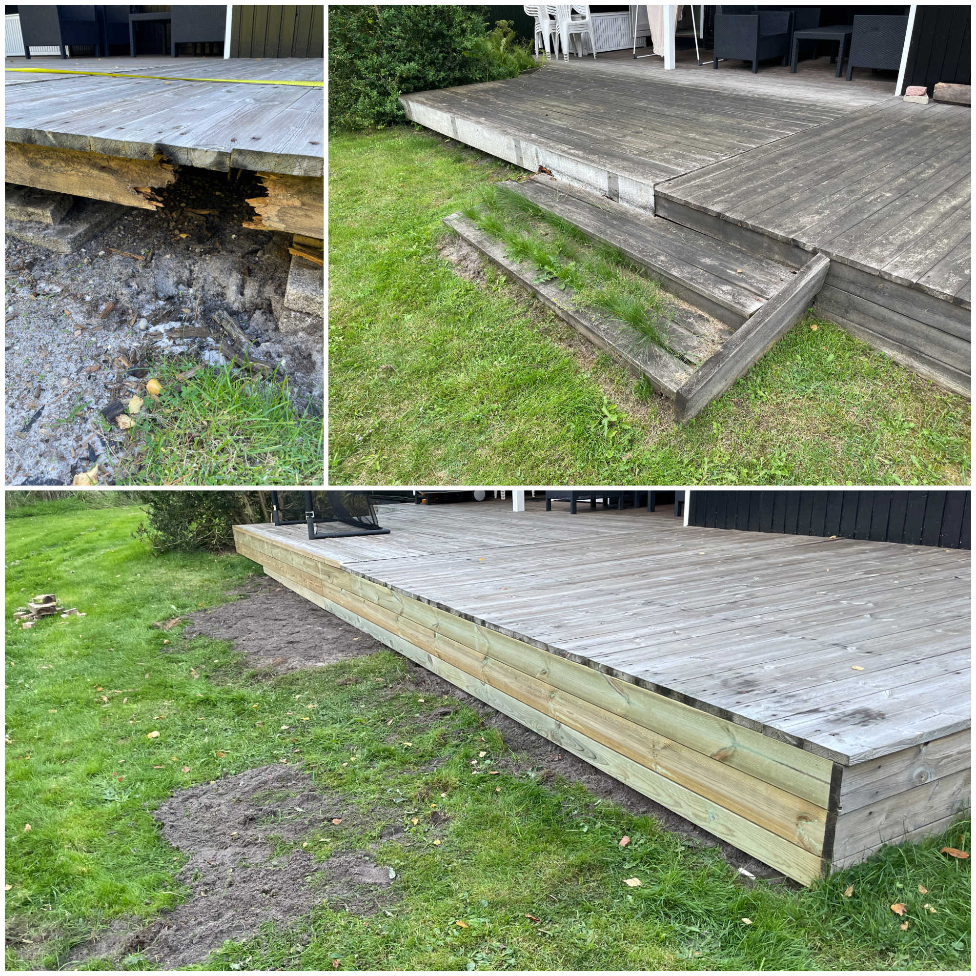 EFTER Trin fjernet, bærende bjælke udskiftet, fronten udskiftet til en ensartet flade. Renset og imprægneret.